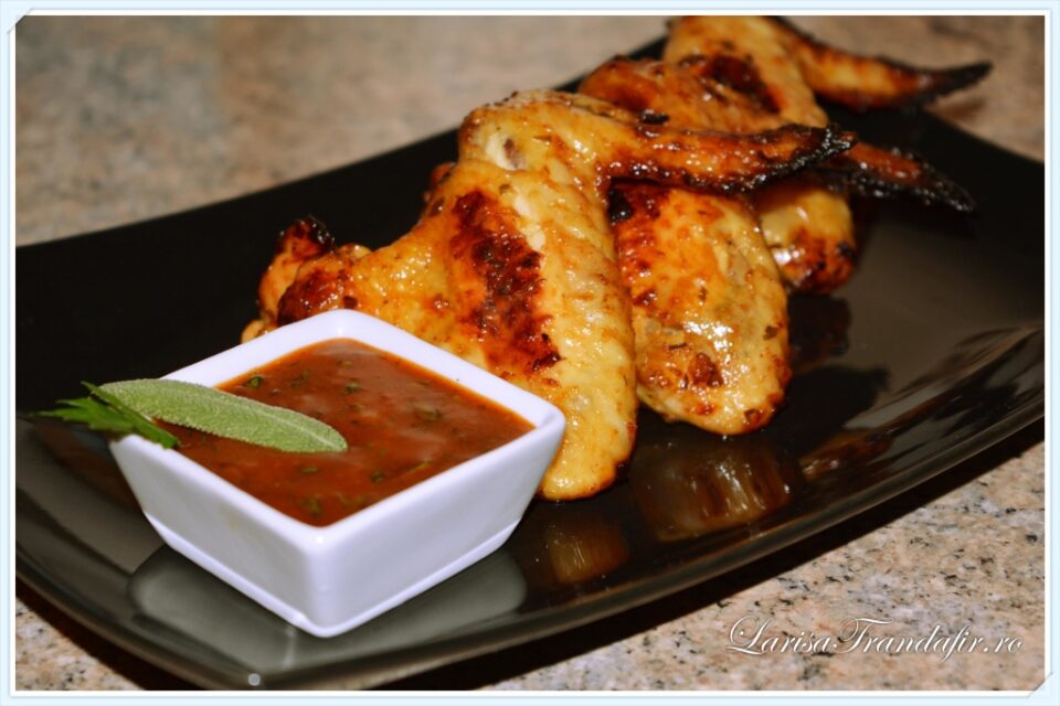 - Aripioarele se aseaza intr-o tava tapetata cu foaie de copt si se ung cu sosul de mai sus.