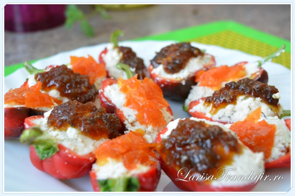 - Pe deasupra se aseaza cate o lingurita de dulceata de ardei iuti, astfe incat sa formam un mix de barcute.