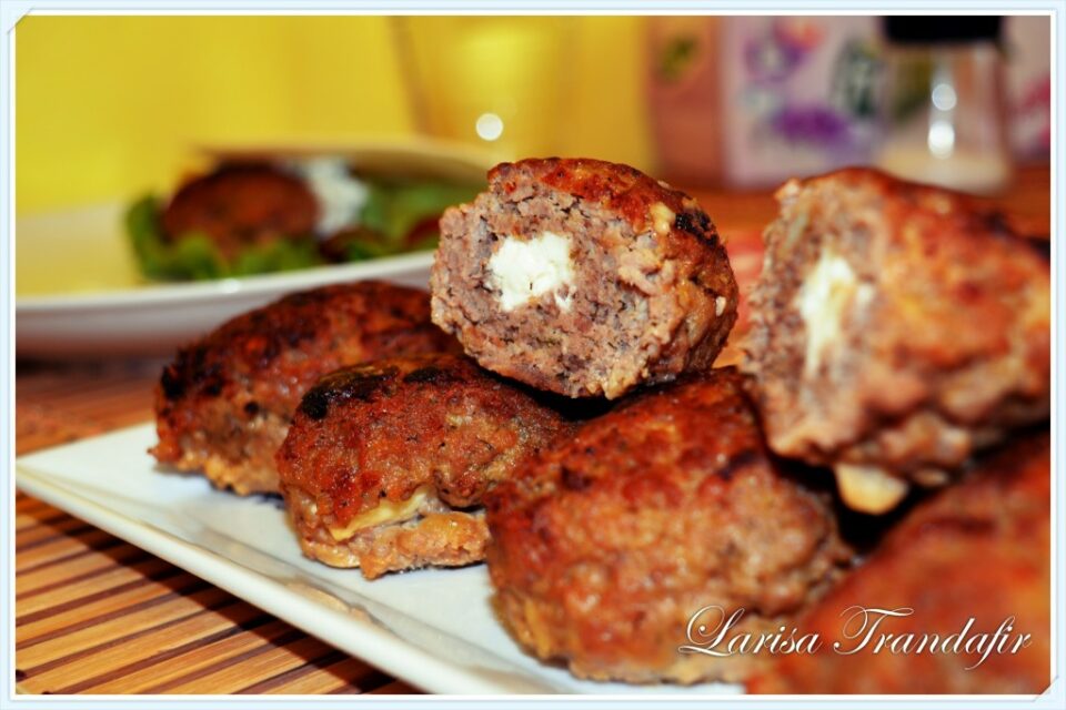 - Din amestecul de mai sus se formeaza chiftele mai marisoare in centrul carora se adauga branza taiata fasie pe lung si se sigileaza bine.