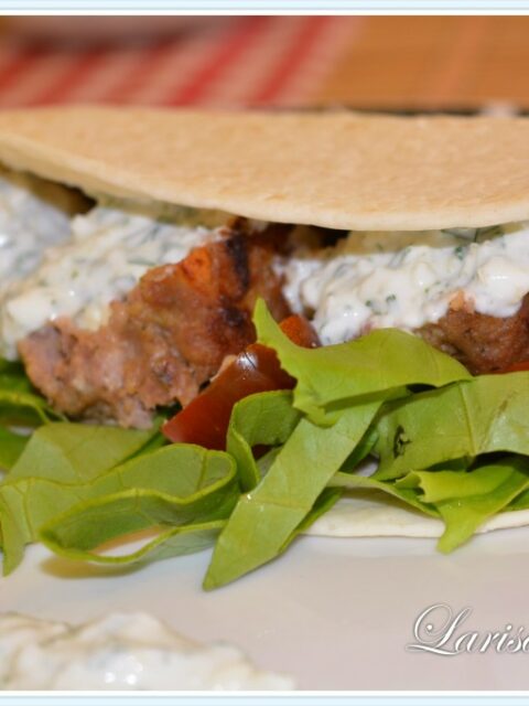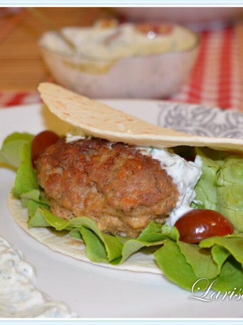 Chiftele din carne de miel cu chimion si umplutura de branza telemea, ascunse intr-o tortilia pufoasa cu rosii cherry kumato si salata verde, alaturi de un sos de iaurt cu mirodenii si usturoi.