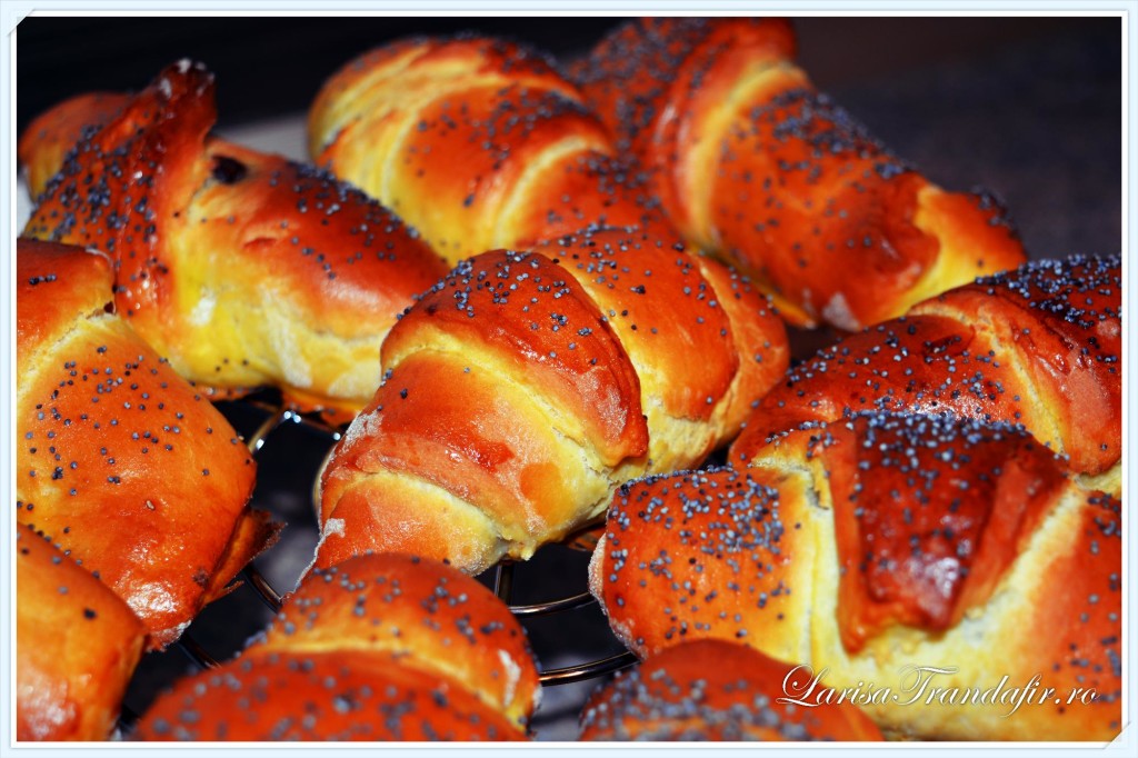 - Asezam cornuletele intr-o tava, le ungem cu o compozitie rezultata din 2 galbenusuri si 4 linguri de lapte, si deasupra presaram seminte de mac.