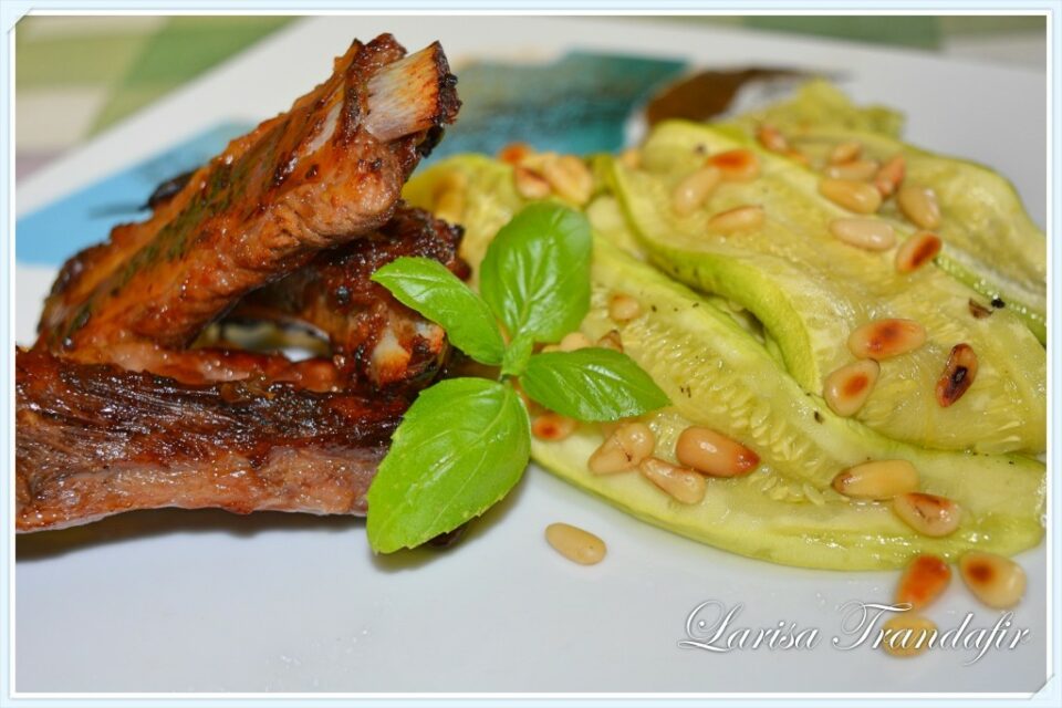 Costite marinate de porc in suc de limete cu dovlecei la cuptor si seminte de pin.