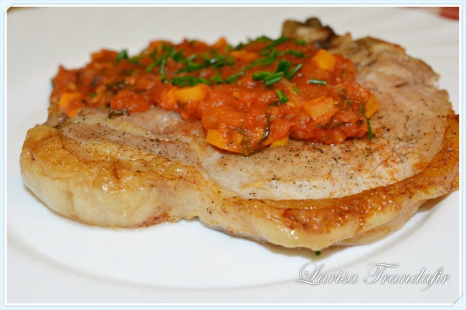Cotlet de porc asezonat cu legume rosii: un fel principal ce imbina proteinele cu legumele alaturi de o nota puternica de busuioc si firisoare de chives.
