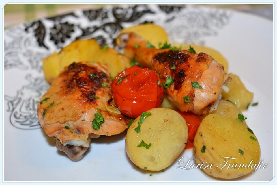 O reteta care imbina fragezimea puiului de tara cu un amestec de legume format din rosii, cartofi si dovlecei.