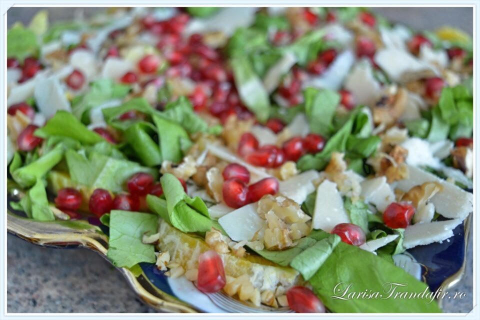 - Pe o farfurie/platou intins(a) se aseaza rondelele de portocala, fasiute de salata si andiva, se presara miez de nuca, se rade parmezan si se aseaza semintele de rodie.