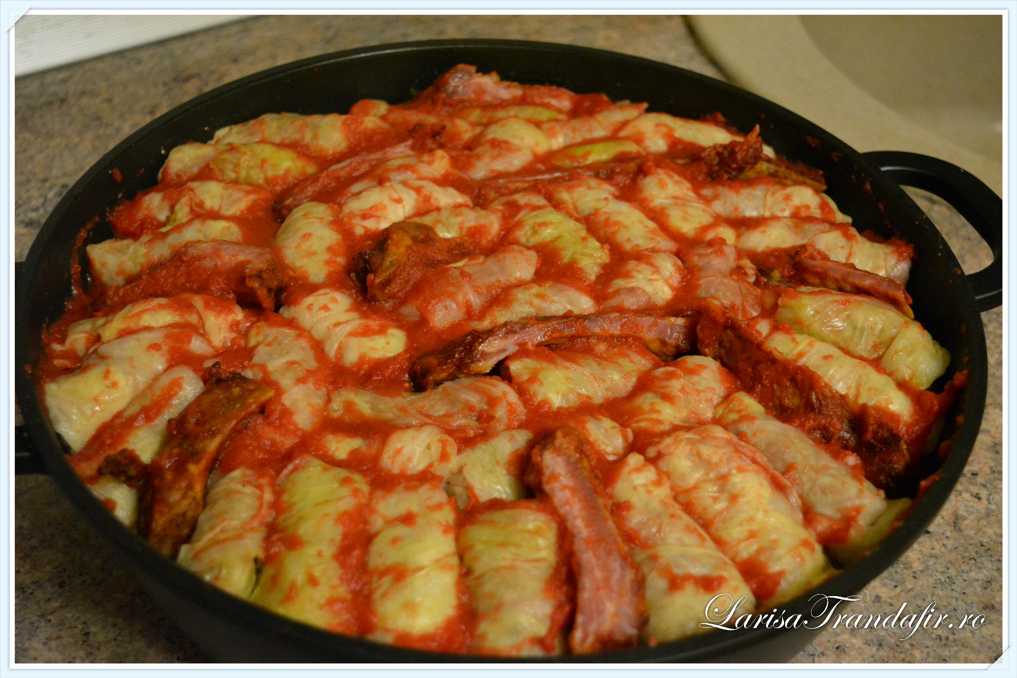- Intre sarmale, asezam bucati de coasta afumata si boabele de piper ramase. Le invelim cu restul de varza tocata.