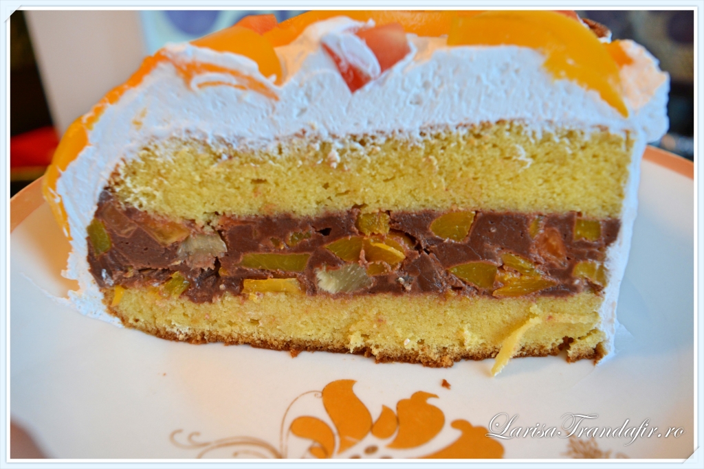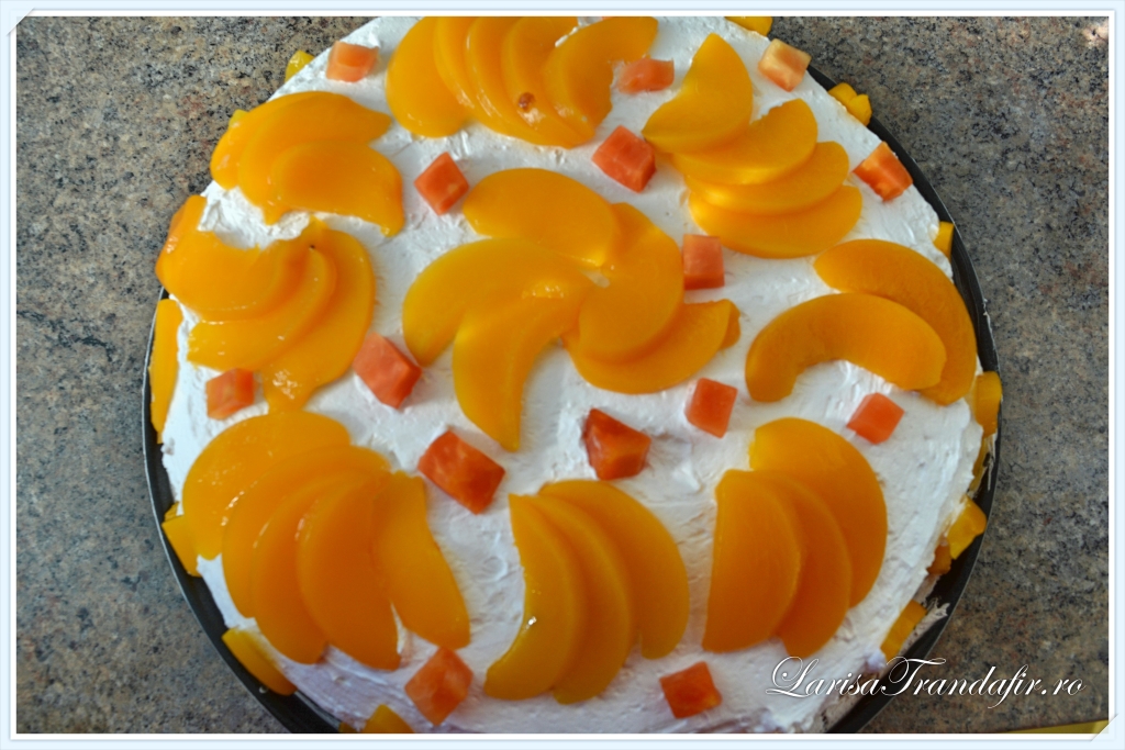 - Se mixeaza smantana pana obtinem o frisca spumoasa cu care se imbraca tortul si peste care se presara fructele din compot oprite.